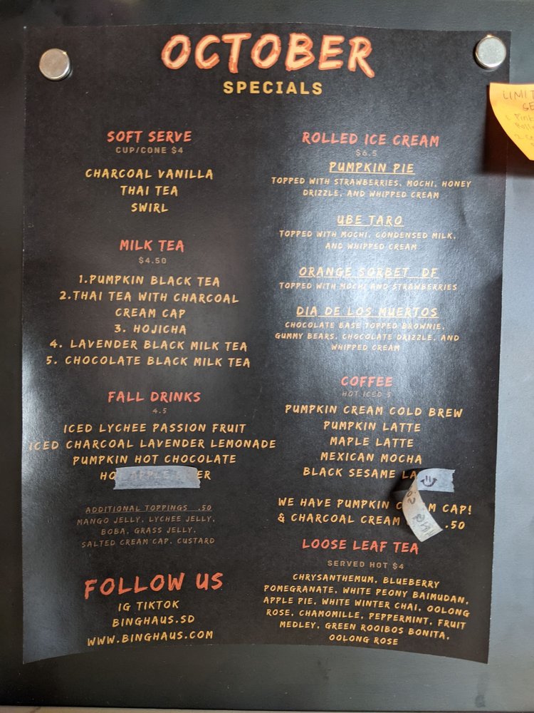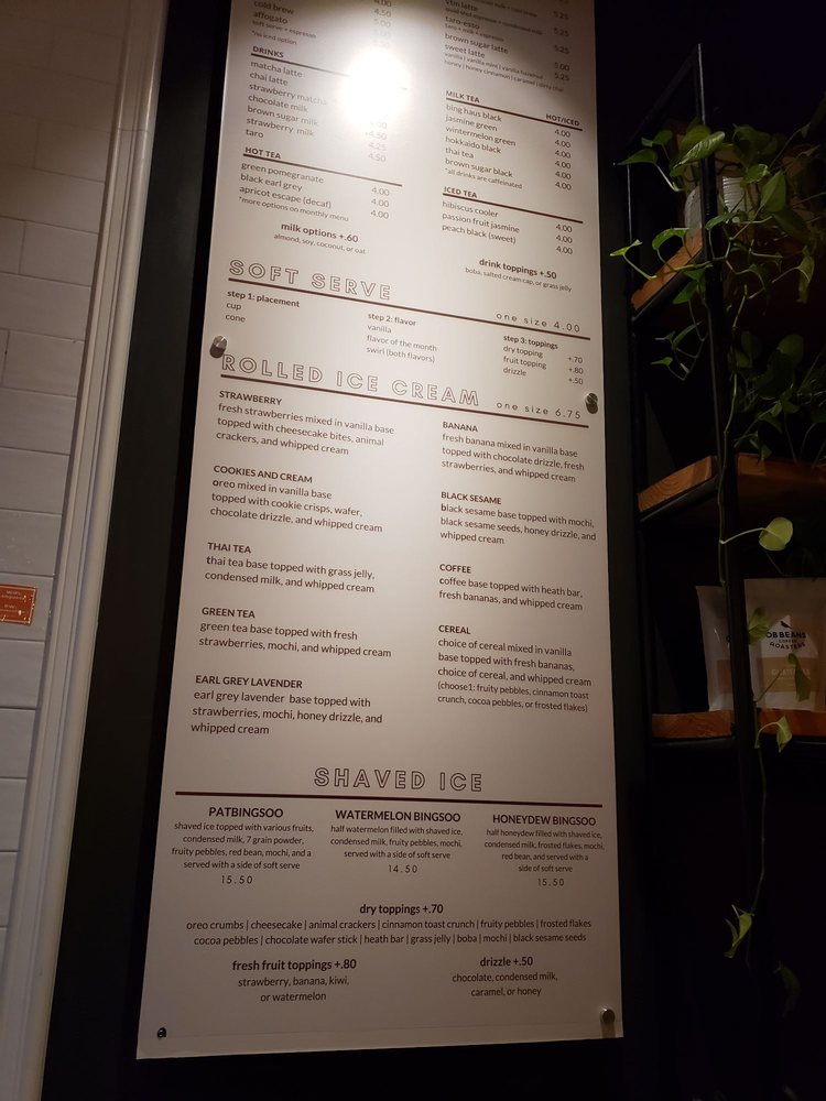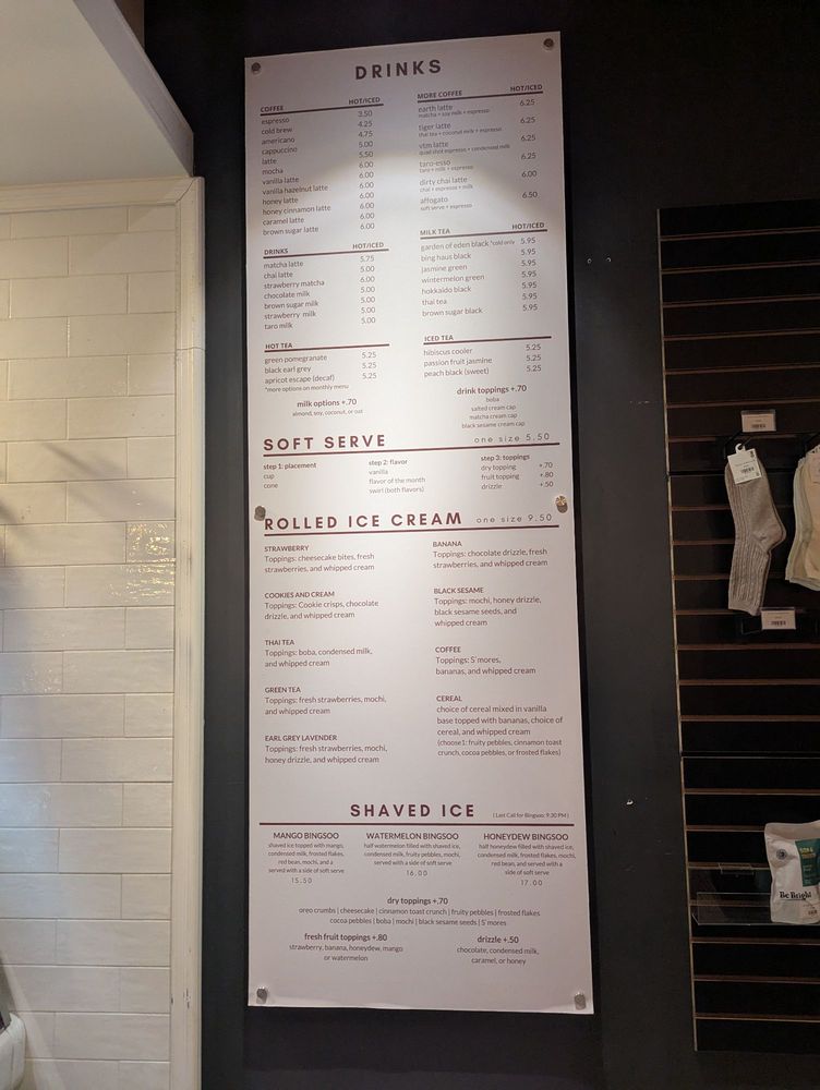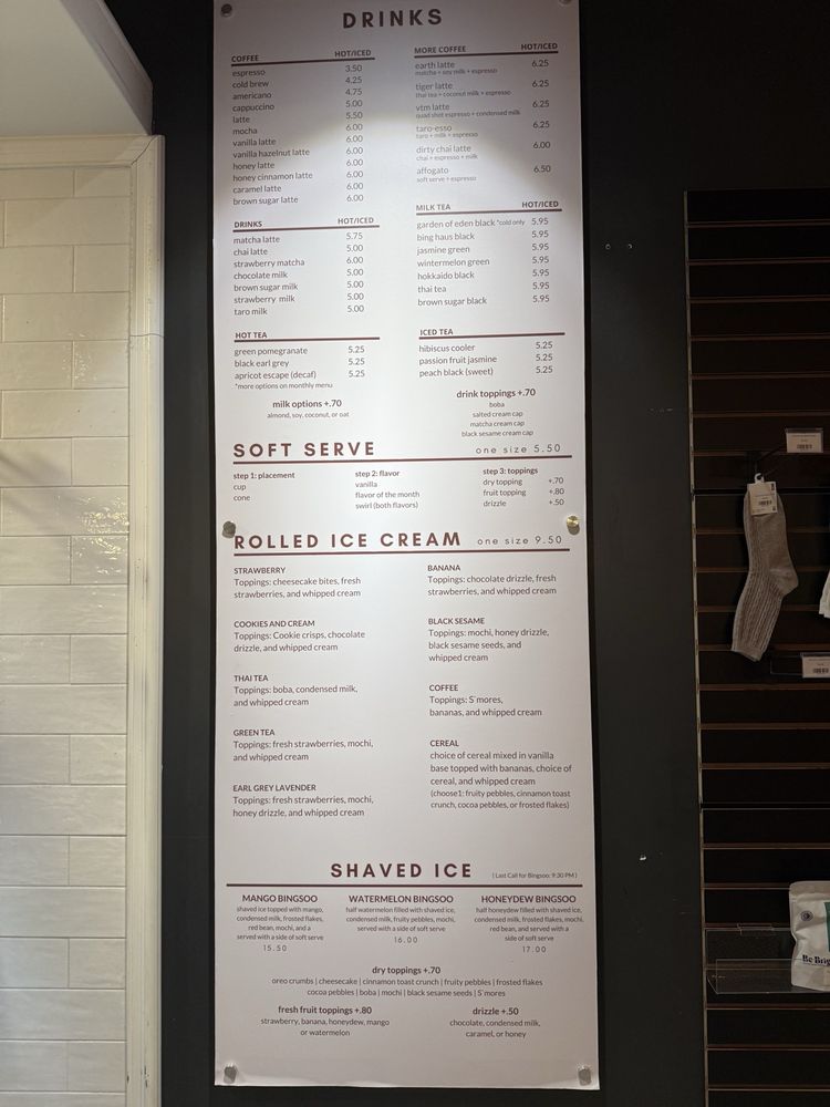 Welcome to Bing Haus, a delightful dessert haven located in the heart of San Diego. Specializing in donuts and innovative rolled ice cream, this charming café is a must-visit for dessert aficionados. Their menu features a rich variety of flavors, including Black Sesame, Green Tea, and even a playful Cereal rolled ice cream, all priced at $6.75. For those craving something light yet flavorful, the Patbingsoo shaved ice is a standout, artfully crafted with fresh fruits and mochi. Priced around $16, it’s perfect for sharing.