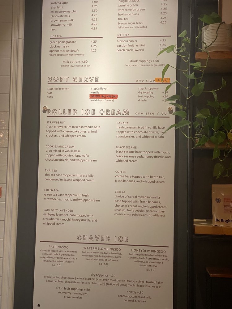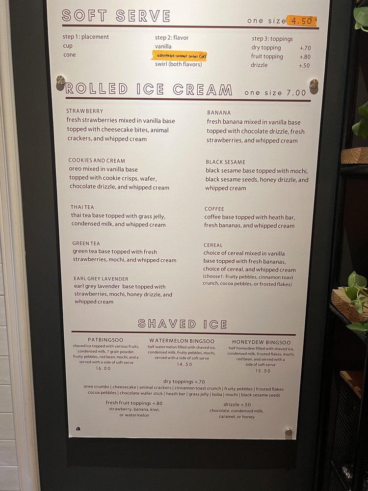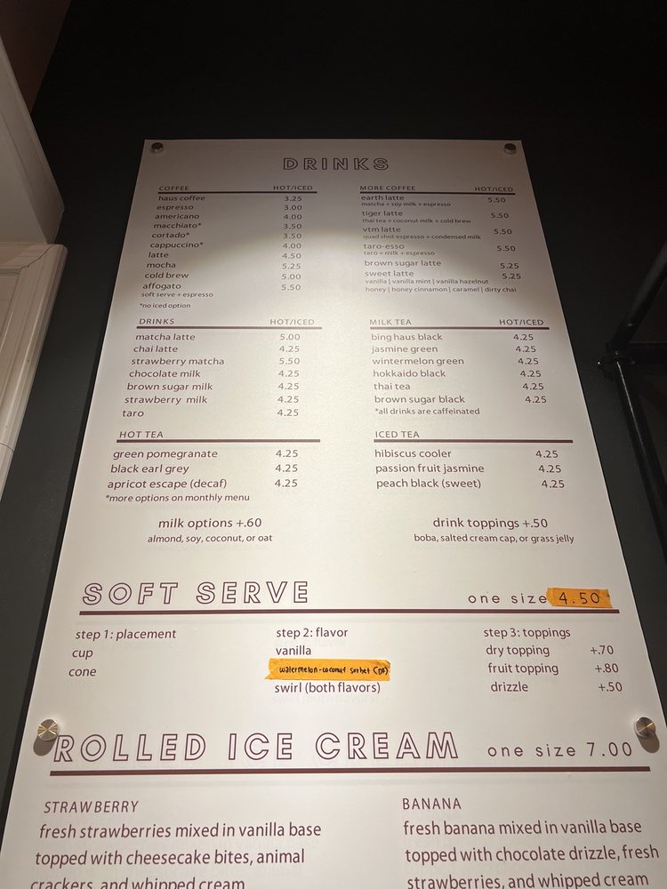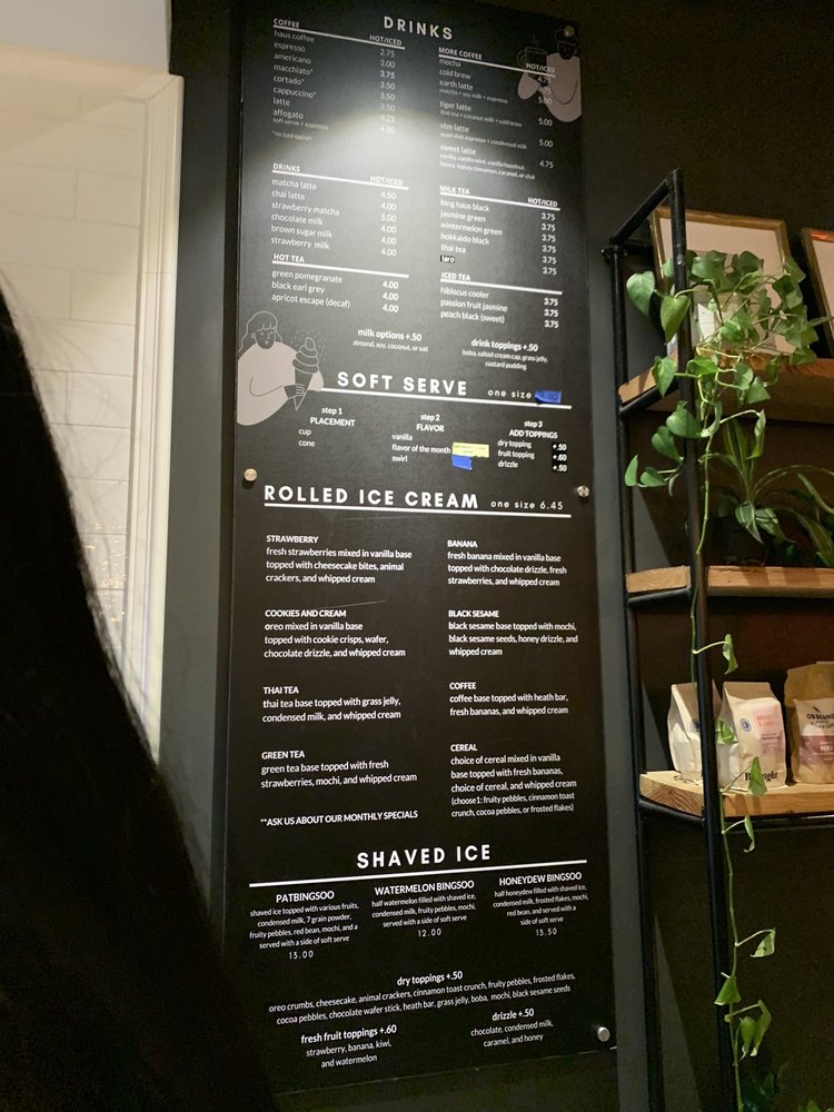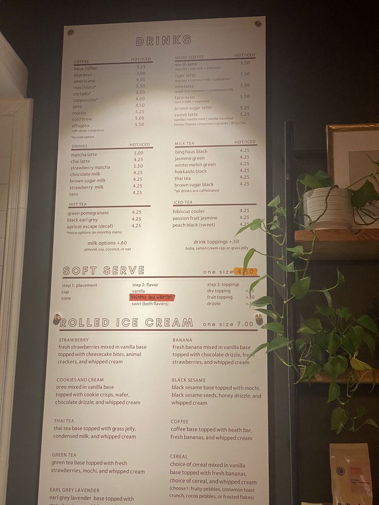 Welcome to Bing Haus, a delightful dessert haven located in the heart of San Diego. Specializing in donuts and innovative rolled ice cream, this charming café is a must-visit for dessert aficionados. Their menu features a rich variety of flavors, including Black Sesame, Green Tea, and even a playful Cereal rolled ice cream, all priced at $6.75. For those craving something light yet flavorful, the Patbingsoo shaved ice is a standout, artfully crafted with fresh fruits and mochi. Priced around $16, it’s perfect for sharing.